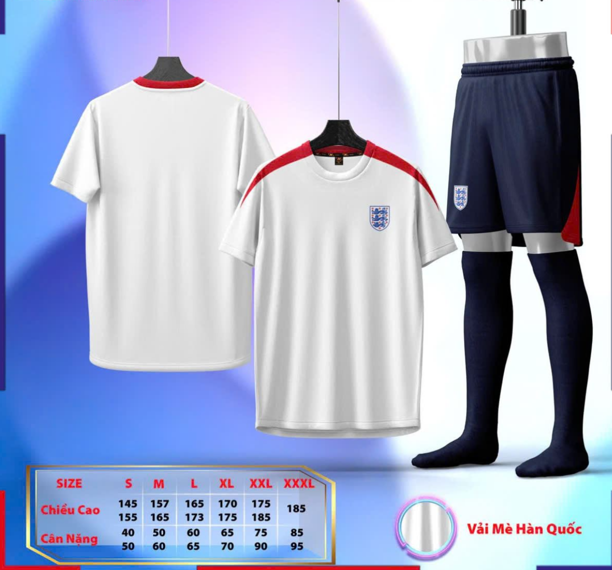 Tông trắng chủ đạo tạo cảm giác sạch sẽ, mạnh mẽ và dễ phối đồ. Phần viền đỏ ở vai giúp tổng thể có điểm nhấn rõ ràng, nhìn năng động mà không rối mắt. Logo đội tuyển Anh và các chi tiết được in sắc nét, cho cảm giác chỉn chu như đồ đội tuyển.